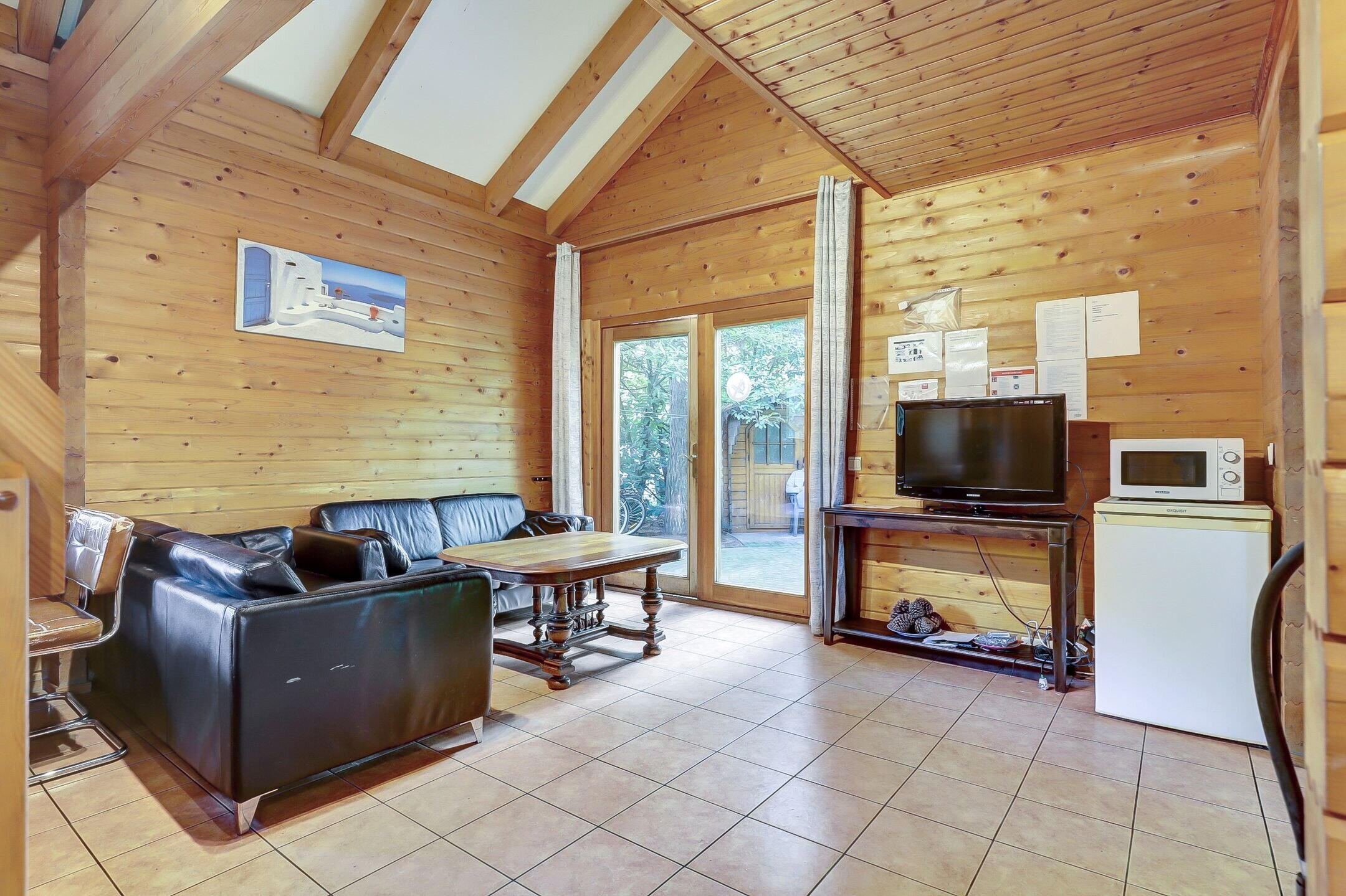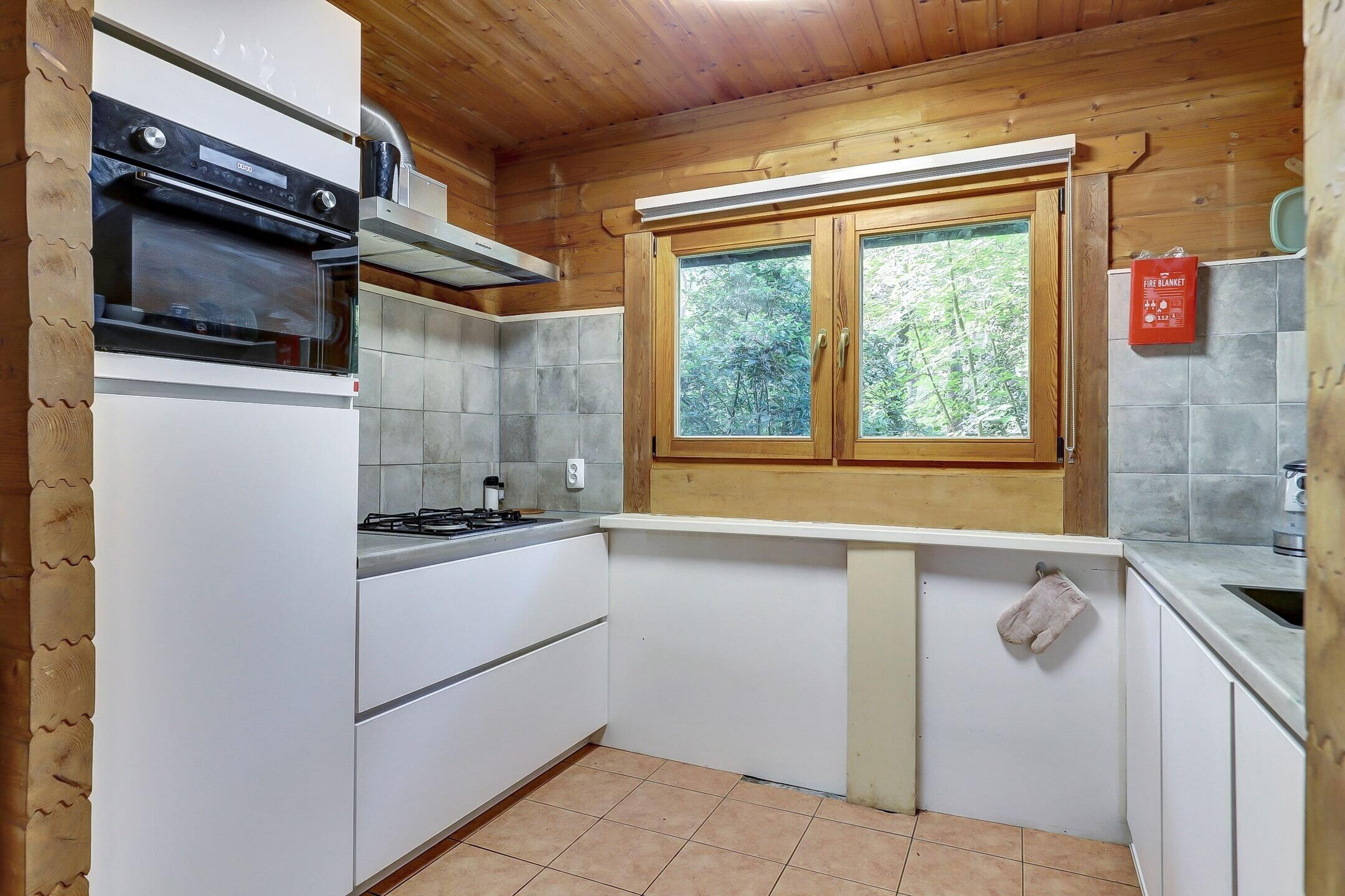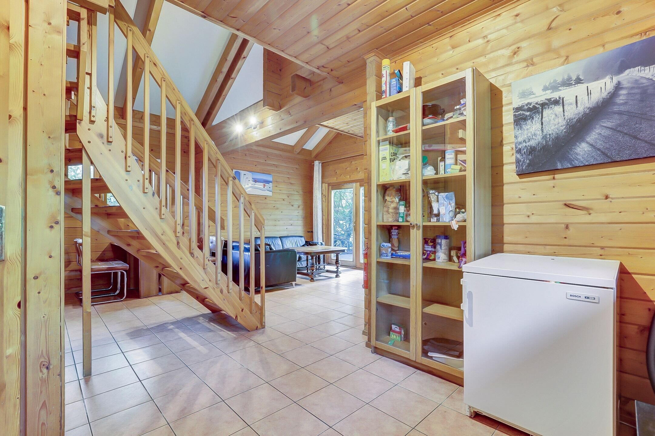 De woonkamer is licht en sfeervol, met aan alle kanten uitzicht op het omringende groen en het bos. Dankzij de diverse draaikiepramen en de openslaande deuren naar de tuin lijkt het alsof de natuur tot binnen reikt. De open keuken sluit aan op het leefgedeelte en is voorzien van alle gemakken. Je kookt er op een vierpits gasfornuis of schuift eenvoudig een maaltijd in de combi-oven. De vaatwasser neemt na afloop het werk uit handen, zodat jij volop kunt ontspannen. De tegelvloer met vloerverwarming zorgt voor een aangename temperatuur door het hele jaar heen.