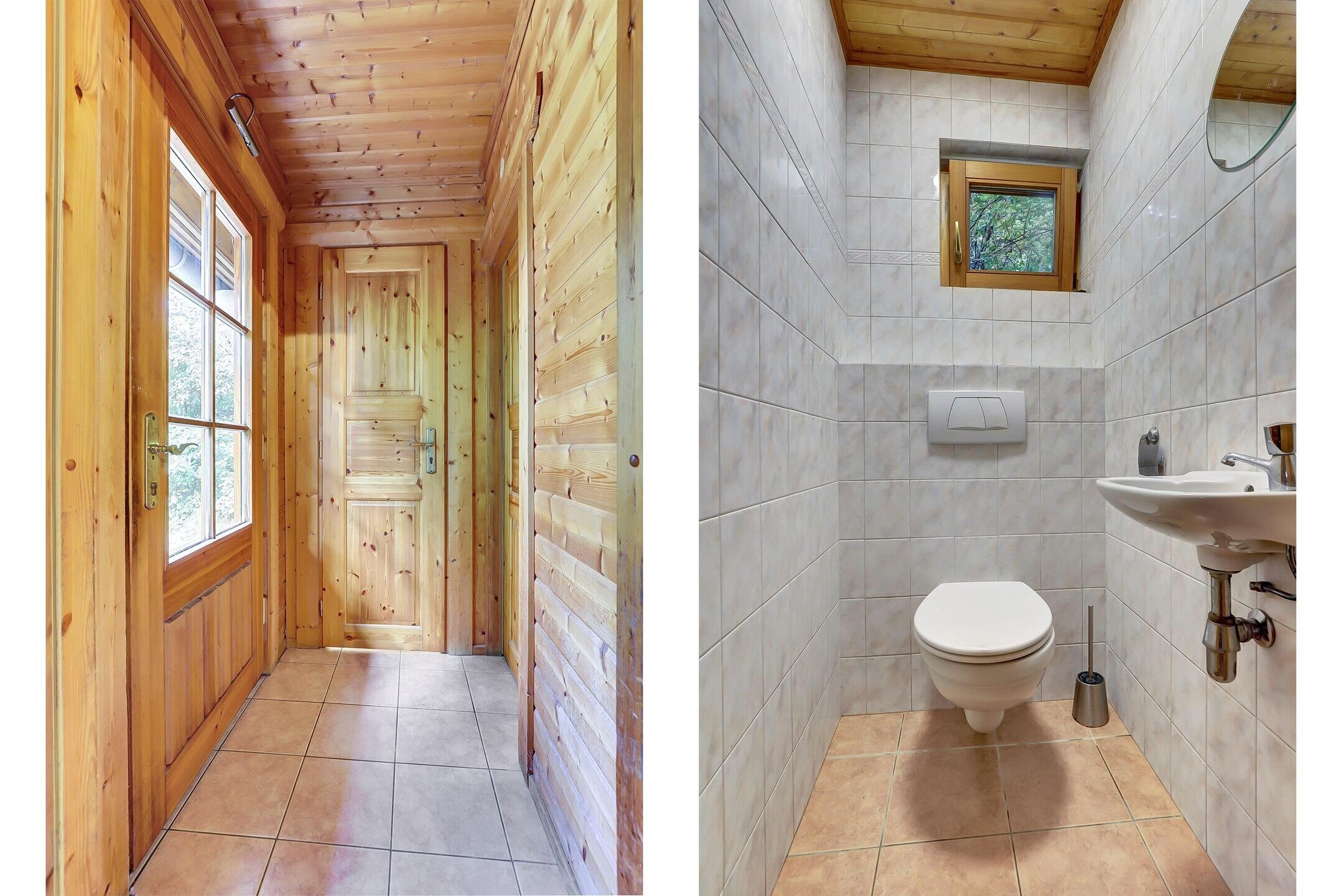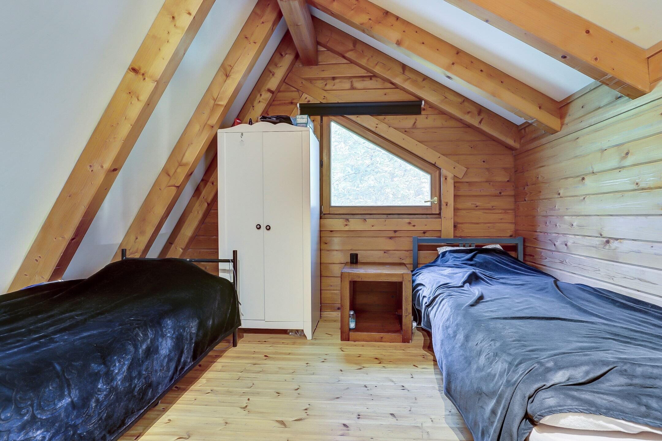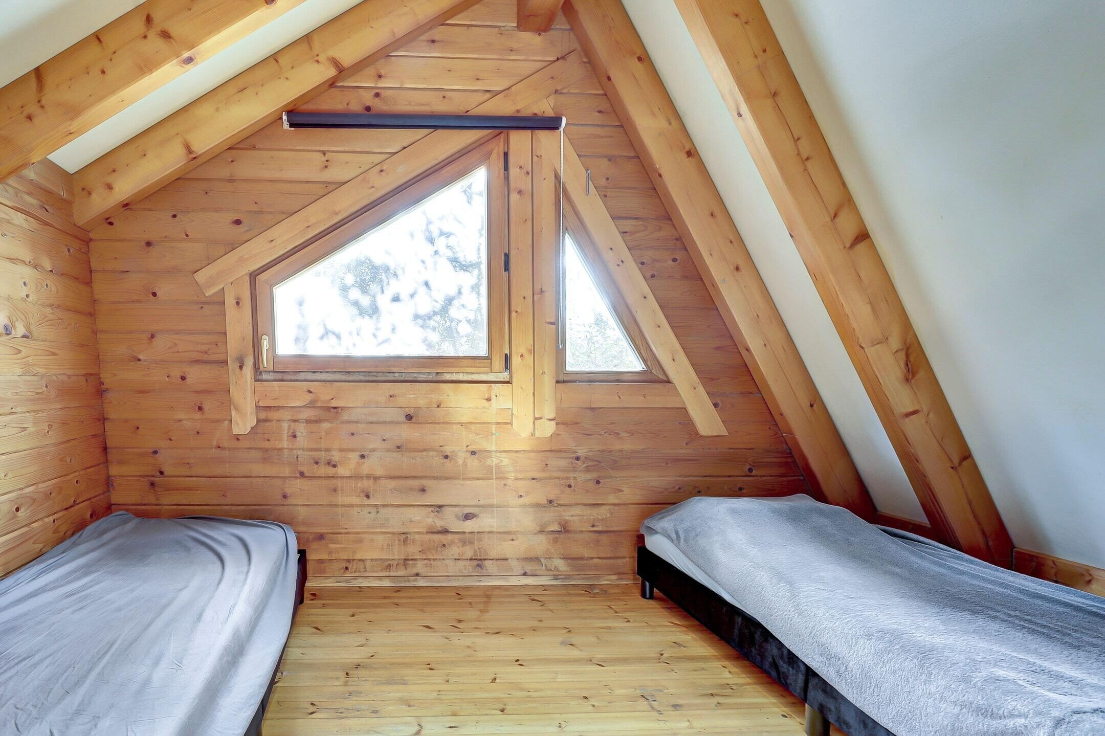 De slaapkamer op de begane grond heeft een hoog puntdak en een dubbel draaikiepraam. Deze kamer biedt hetzelfde comfort dankzij de vloerverwarming en heeft directe toegang tot de badkamer, waar zowel een douche als een ligbad aanwezig zijn waardoor je de dag ontspannen af kunt sluiten.