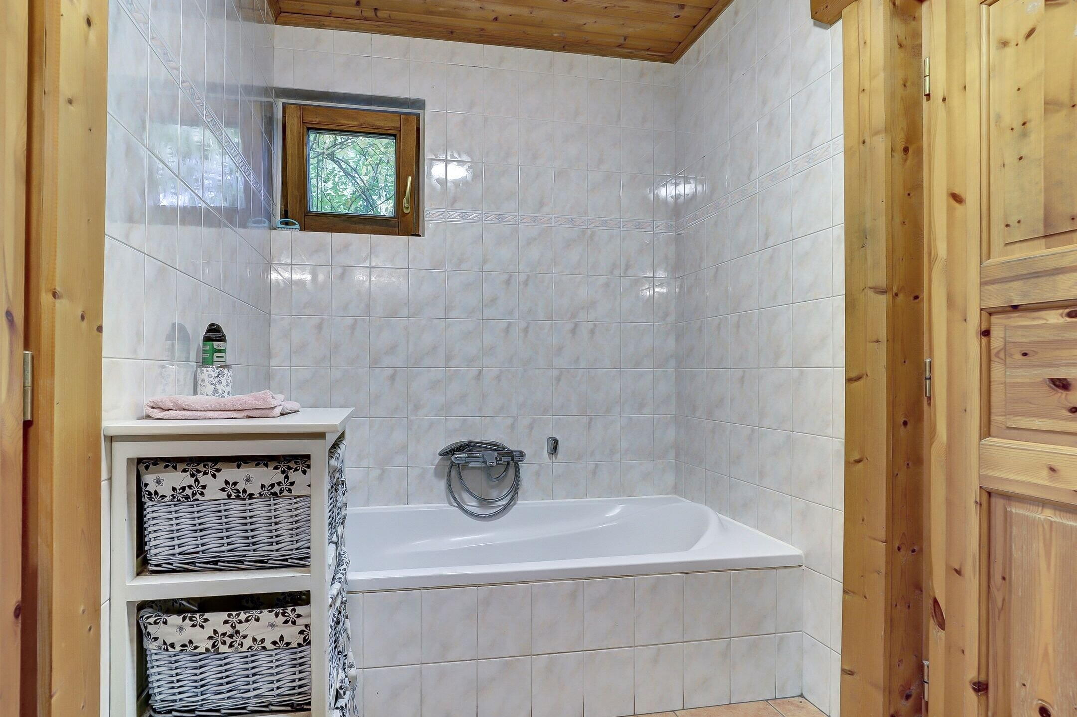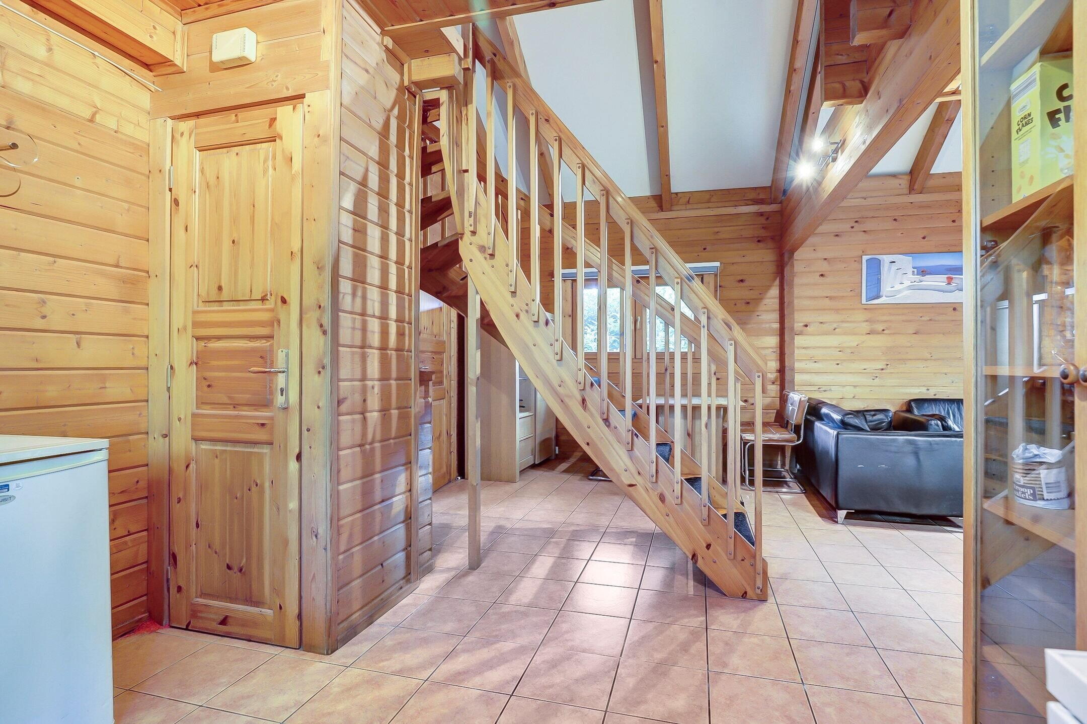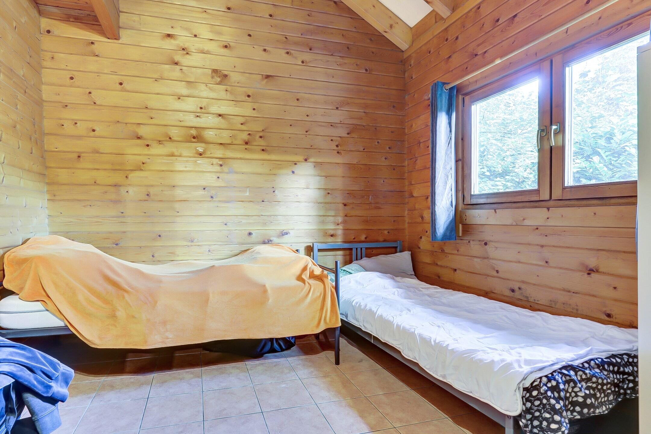De slaapkamer op de begane grond heeft een hoog puntdak en een dubbel draaikiepraam. Deze kamer biedt hetzelfde comfort dankzij de vloerverwarming en heeft directe toegang tot de badkamer, waar zowel een douche als een ligbad aanwezig zijn waardoor je de dag ontspannen af kunt sluiten.