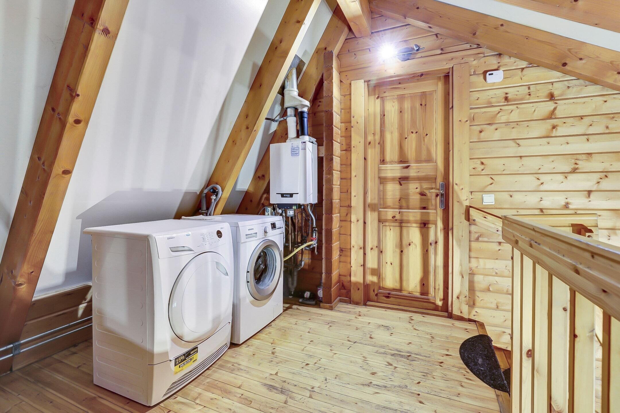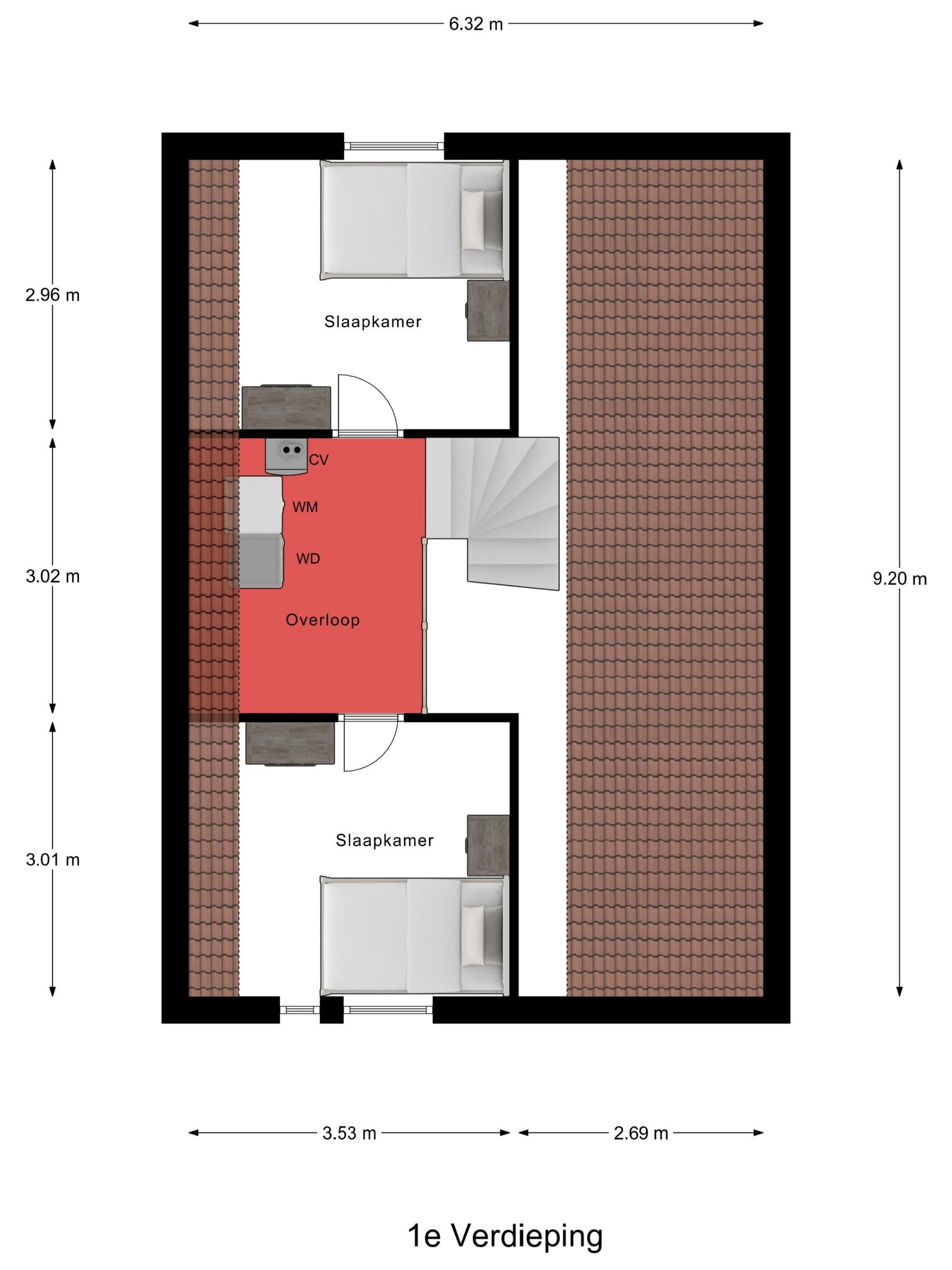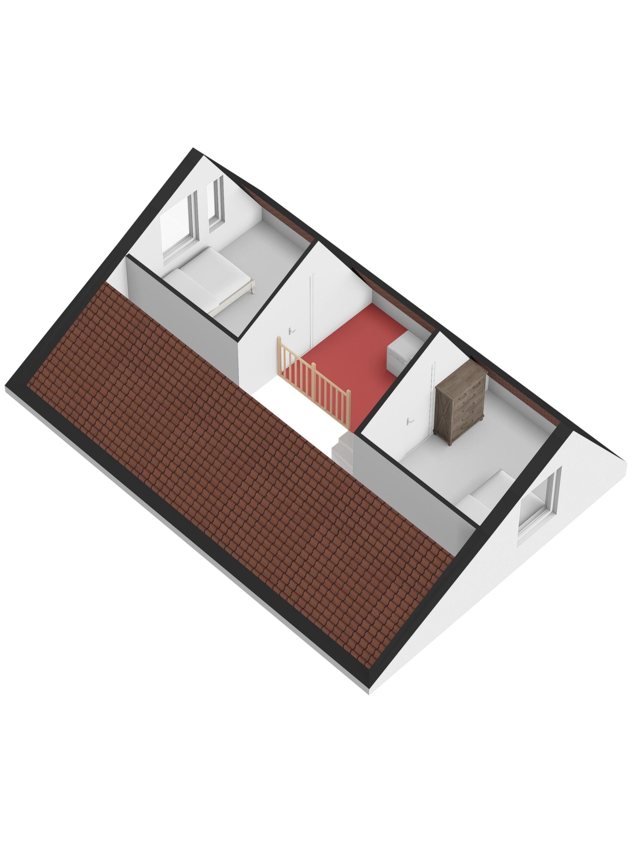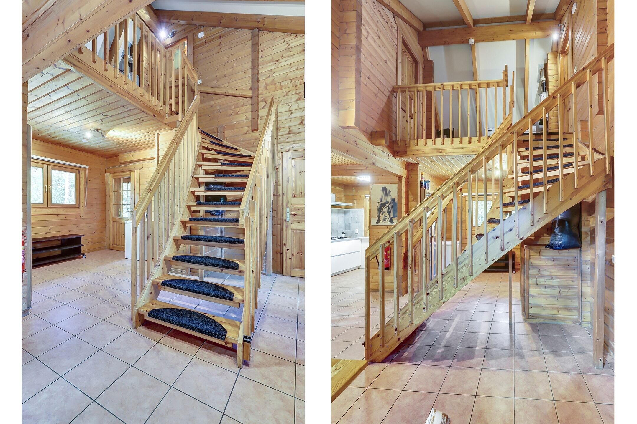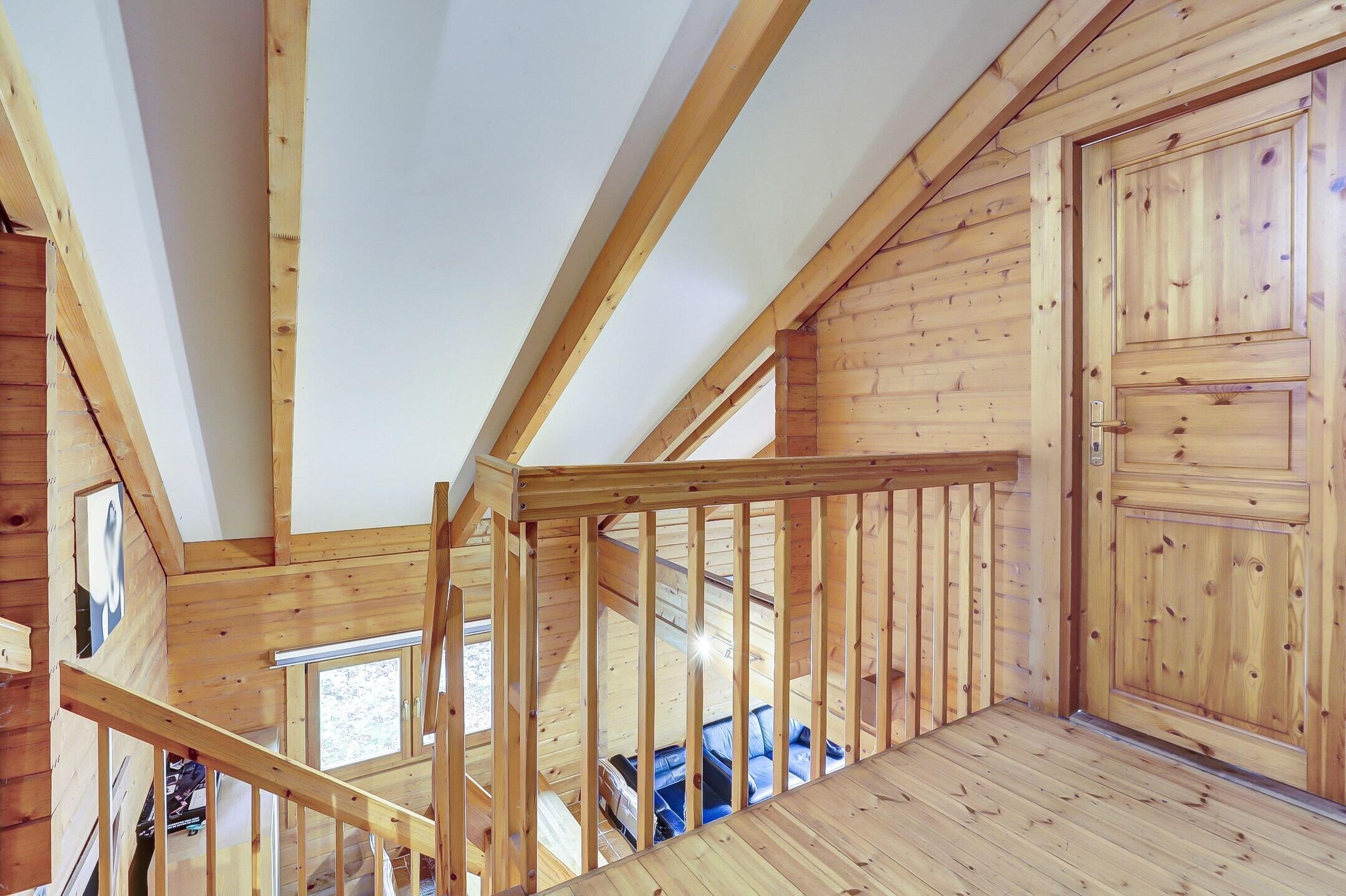 De verdieping is bereikbaar via een fraaie wenteltrap vanuit de woonkamer. Boven aangekomen kom je op een overloop met balustrade, waar zich de aansluitingen voor witgoed bevinden, praktisch en netjes weggewerkt. Aan weerszijden van deze overloop liggen twee gelijkwaardige slaapkamers. Beide kamers stralen warmte en knusheid uit door het puntdak en de houten vloeren en wanden die perfect passen bij het natuurlijke karakter van de woning. De schuine draaikiepramen zorgen voor een mooi uitzicht op het bos en laten veel daglicht binnen. Deze verdieping biedt volop ruimte voor logees, (klein)kinderen of om één van de kamers in te richten als werkkamer of hobbyruimte.
