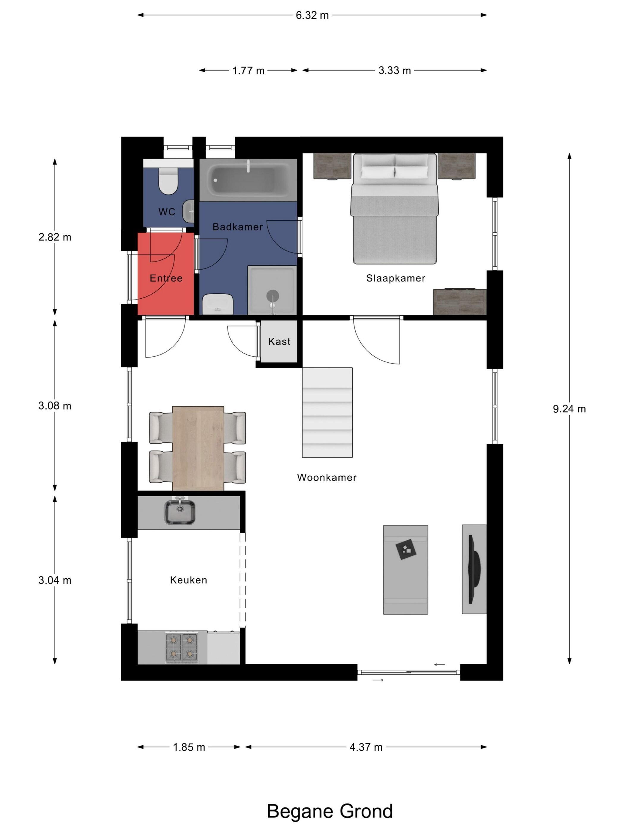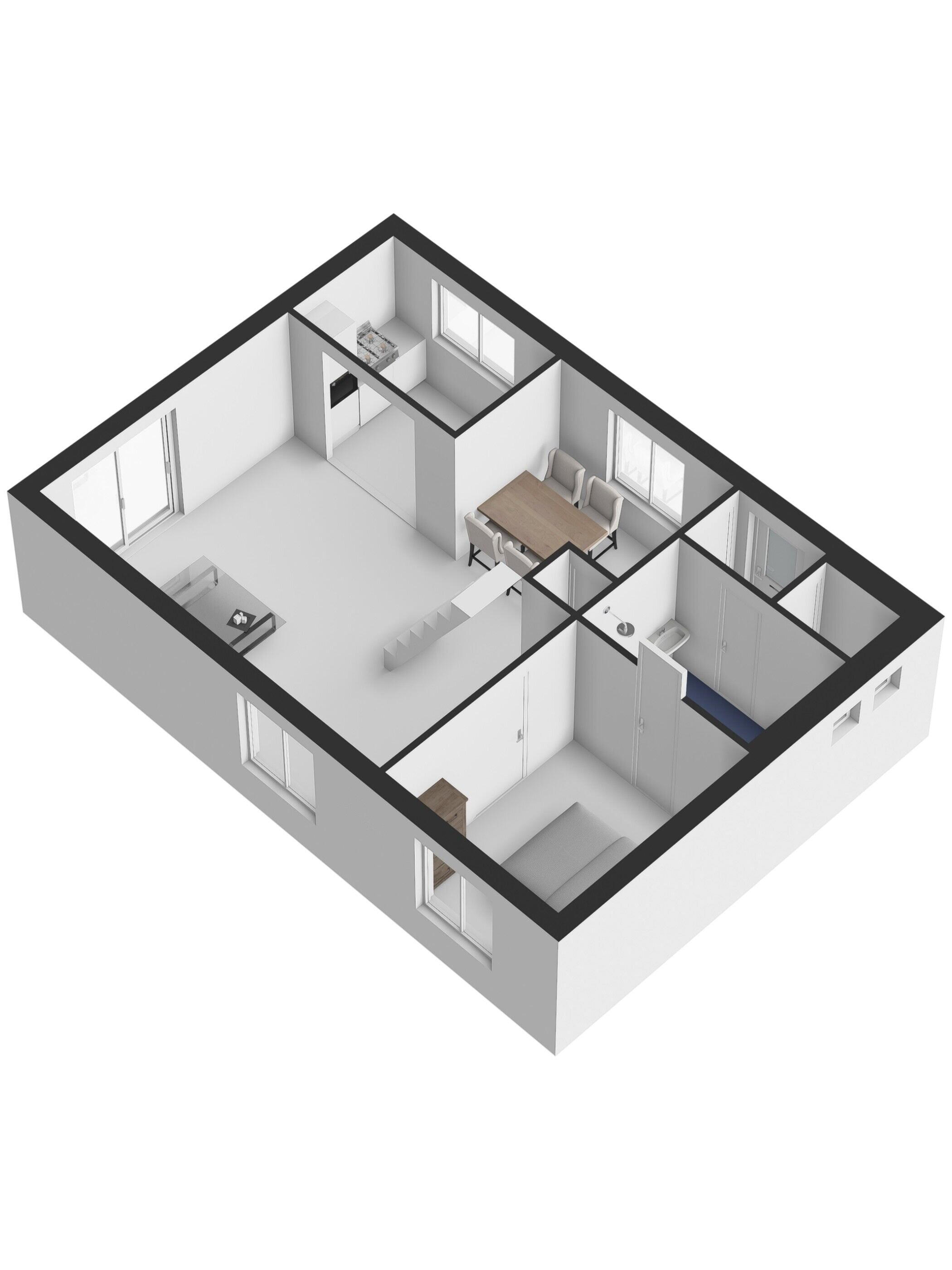 Via de lange oprit kom je aan bij de voordeur van de woning. Deze opent naar een prettige gang die naadloos overgaat in de ruime woonkamer met open keuken. Vanuit de gang heb je direct toegang tot zowel de badkamer als het afzonderlijke toilet. In de gang is voldoende ruimte voor een garderobe en bijvoorbeeld een (schoenen)kast en een extra koelkast of vriezer. In de praktische trapkast bevindt zich de meterkast.